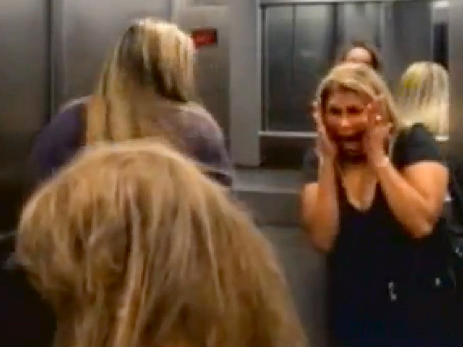 The video, which runs just under ten seconds, is a masterclass in distilled panic. It opens with the woman, dressed in a practical green padded jacket, standing in a standard, brightly lit elevator car. Her face, a mask of immediate, wide-eyed terror, is directed upwards. What immediately commands attention is her hair: an astonishingly long, dark cascade that appears to be sucked up and gripped by the narrow space between the top of the elevator car and the ceiling of the shaft, or perhaps the closing door mechanism itself.