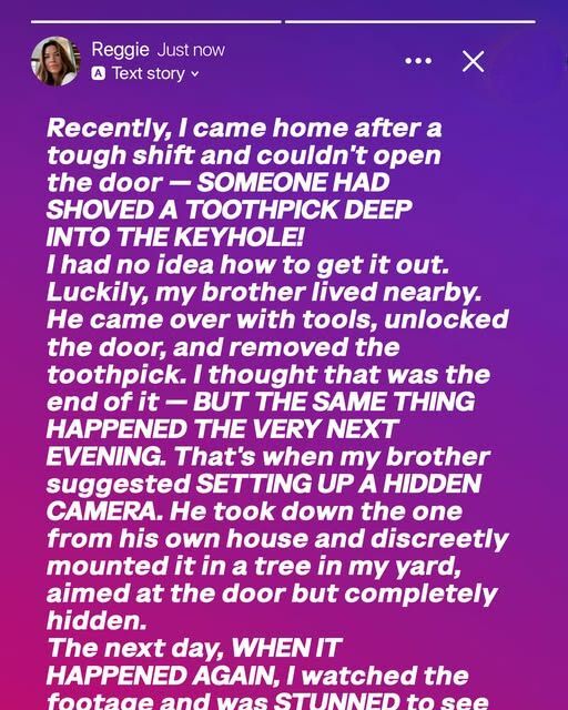 My brother skillfully unlocked the door and extracted the toothpick, which I thought would be the end of the bizarre occurrence. However, to my dismay, the very next evening, I faced the same challenge once more. This time, my brother suggested a proactive approach: setting up a hidden camera to capture the culprit in action. He brought over a camera from his own home and discreetly mounted it in a tree in my yard, ensuring it was aimed at the door but completely out of sight. The next day, when it happened again, I eagerly reviewed the footage and was left astounded by what I saw.