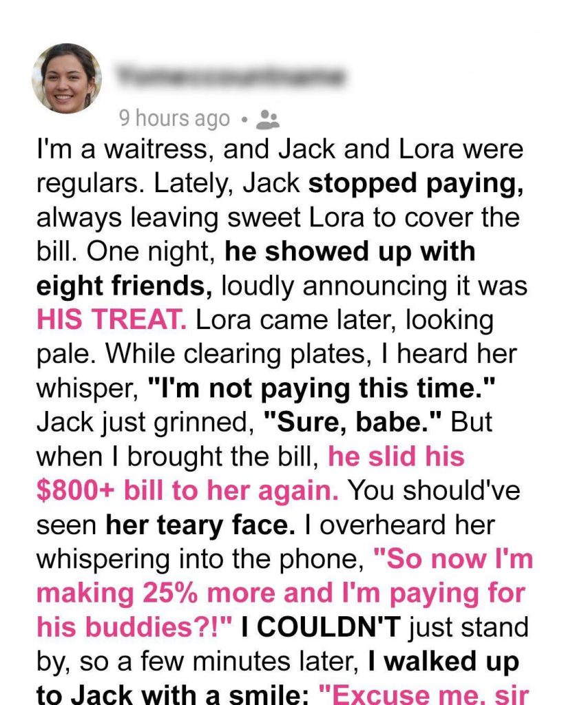 Jack was not just any diner; he was the archetype of a self-absorbed partner who took advantage of Lora’s kindness. Initially, they had been a couple who shared everything—laughter, dessert, and, yes, the bill. But as their relationship progressed, Jack had transformed.