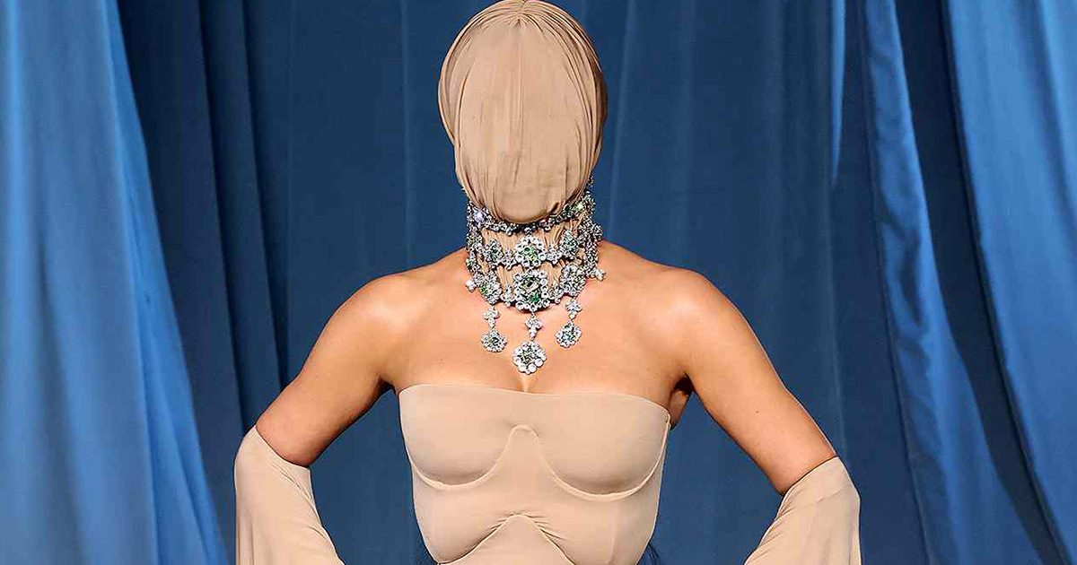 Kardashian, known for her ability to command attention on the red carpet, chose to don a skin-toned Maison Margiela gown that featured a unique sock-like mask. The mask obscured her features to the point where only the barest hint of her identity remained visible. This was not the first time she had opted for a masked look; at the same gala in 2021, she turned heads in an all-black Balenciaga catsuit that concealed her entire head, creating an air of mystery and intrigue. However, this year’s look seemed to provoke even stronger reactions, as social media erupted with memes and comments about her bold fashion choice.