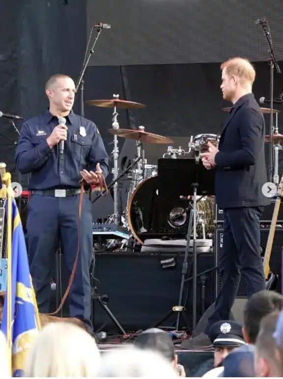 While the Duke and Duchess of Sussex were undoubtedly the main attraction, the event also featured Hollywood star Kevin Costner, a board member of the nonprofit. Costner’s presence added an additional layer of glamour to an evening filled with appreciation for those who risk their lives for the community. His own dedication to philanthropic efforts in the arts and environmental causes resonated well with the audience, emphasizing the evening’s theme of community support. Prince Harry exuded confidence in a textured blue jacket, paired with a relaxed black shirt, engaging in meaningful conversation with Santa Barbara Police Chief Kelly Ann Gordon, while Meghan dazzled in a navy belted shirt dress. Her gold bangles caught the light, complementing her radiant smile that showcased her happiness alongside her husband. This couple’s choice of attire not only reflected their personal style but also conveyed respect for the occasion and the individuals it honored.