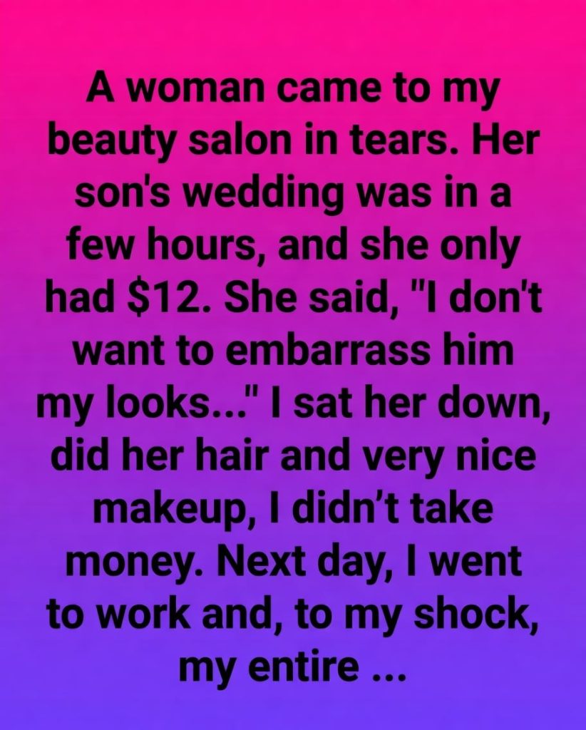 On a crisp morning, as dawn broke and painted the sky in hues of orange and pink, a woman named Mirela stepped into my salon. She clutched a weathered leather purse tightly, as though it contained not only her belongings but also her spirit. Her demeanor was one of fragility; she walked with her shoulders hunched, and her eyes bore the marks of a restless night—red and swollen from tears shed over worries that ran deeper than a single incident. With a quiver in her voice, she revealed her reason for visiting: “My son’s wedding is in a few hours,” she confided, “I don’t want to embarrass him.”