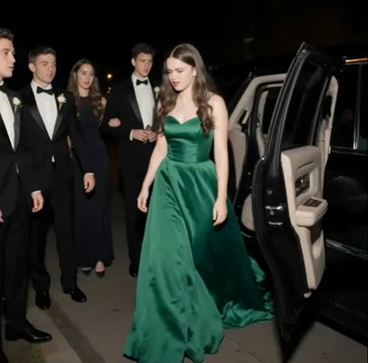 Arriving at the grand entrance of Kingsley High, Grace was met with a sight that took her breath away. A red carpet had been laid out in her honor, shimmering under the bright, inviting lights that illuminated the school’s majestic facade. As the driver opened the door, she stepped out, feeling the fabric of her emerald-green gown swirl around her like a cascade of confidence. The dress sparkled beautifully, capturing the light and the attention of those gathered, a hush falling over the crowd as they turned to witness her entrance. Chloe Whitmore, the queen bee of their class, stood with her clique, their expressions a mixture of disbelief and envy as they whispered among themselves, “Is that really Grace?”