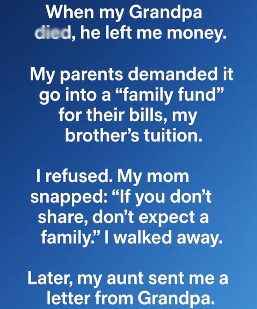 When my grandfather passed away, he left behind not just memories but also a significant financial inheritance intended for me. Almost immediately, my parents proposed that this money should be pooled into a “family fund”—a collective resource to help cover household expenses and contribute towards my brother’s college tuition. They argued it was a rational and mature decision, and as I hesitated, their disappointment loomed over me like a heavy cloud. I had always been the one to avoid conflict, the peacekeeper in our family, and the idea of standing up for my own desires felt foreign and intimidating. However, this inheritance felt different, almost sacred; it was as if it held a profound significance meant solely for me.